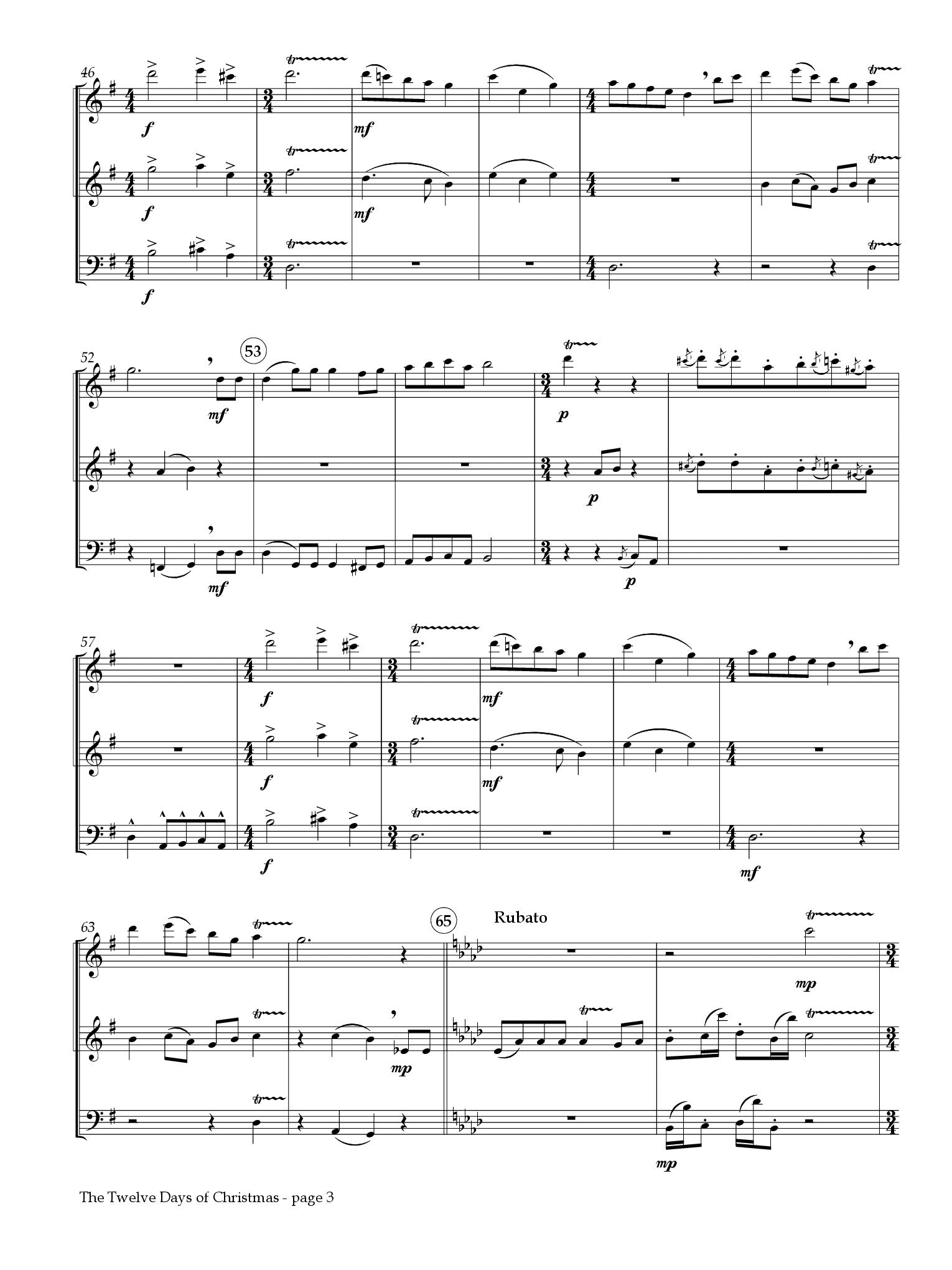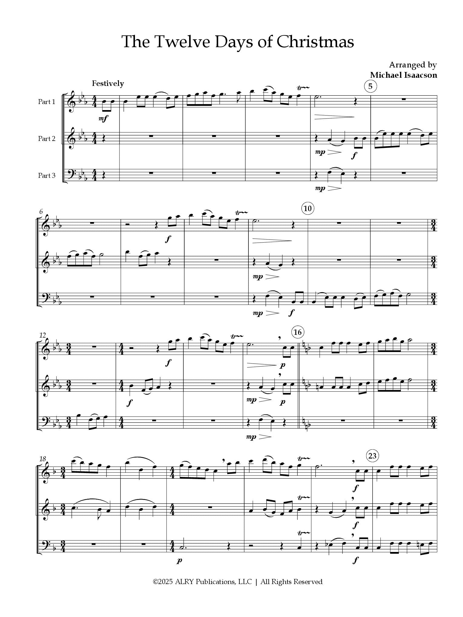 The Twelve Days of Christmas, arranged for chamber trio by Michael Isaacson. An easy arrangement designed to allow equal participation for all players with maximum contrast. Good for either wind or string trio. Newly engraved and updated in 2025.