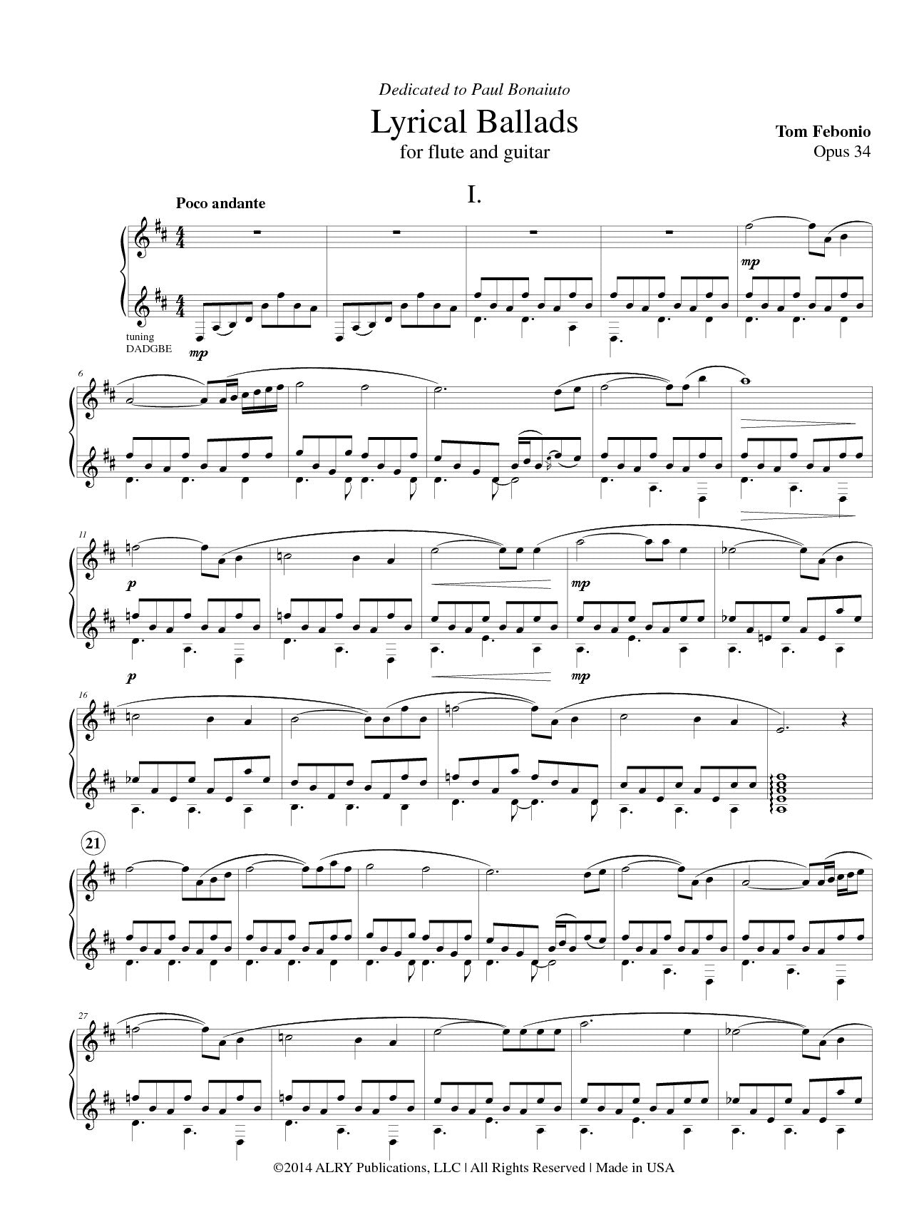 Febonio - Lyrical Ballads for Flute and Guitar - TF08 ALRY Publications Sale! from $18.00 Choose format: Printed Book Only Printed book and PDF via Email INSTANT PDF Qty. Add to Cart SKU: TF08 A collection of 5 pieces, with beautiful and lyrical melodies. Wonderful scoring for flute and guitar. Previous Next