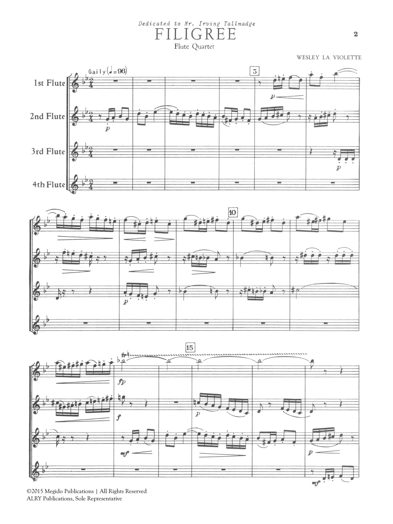 This edition is a reprint Wesley La Violette's Filigree for Flute Quartet. Wesley La Violette (1894–1978) was an American composer, theorist, educator, and writer whose career bridged traditional classical forms and early 20th-century modernism. Born in Saint James, Minnesota, he studied at Northwestern University and the Chicago Musical College, where he later taught and earned a doctorate in music.