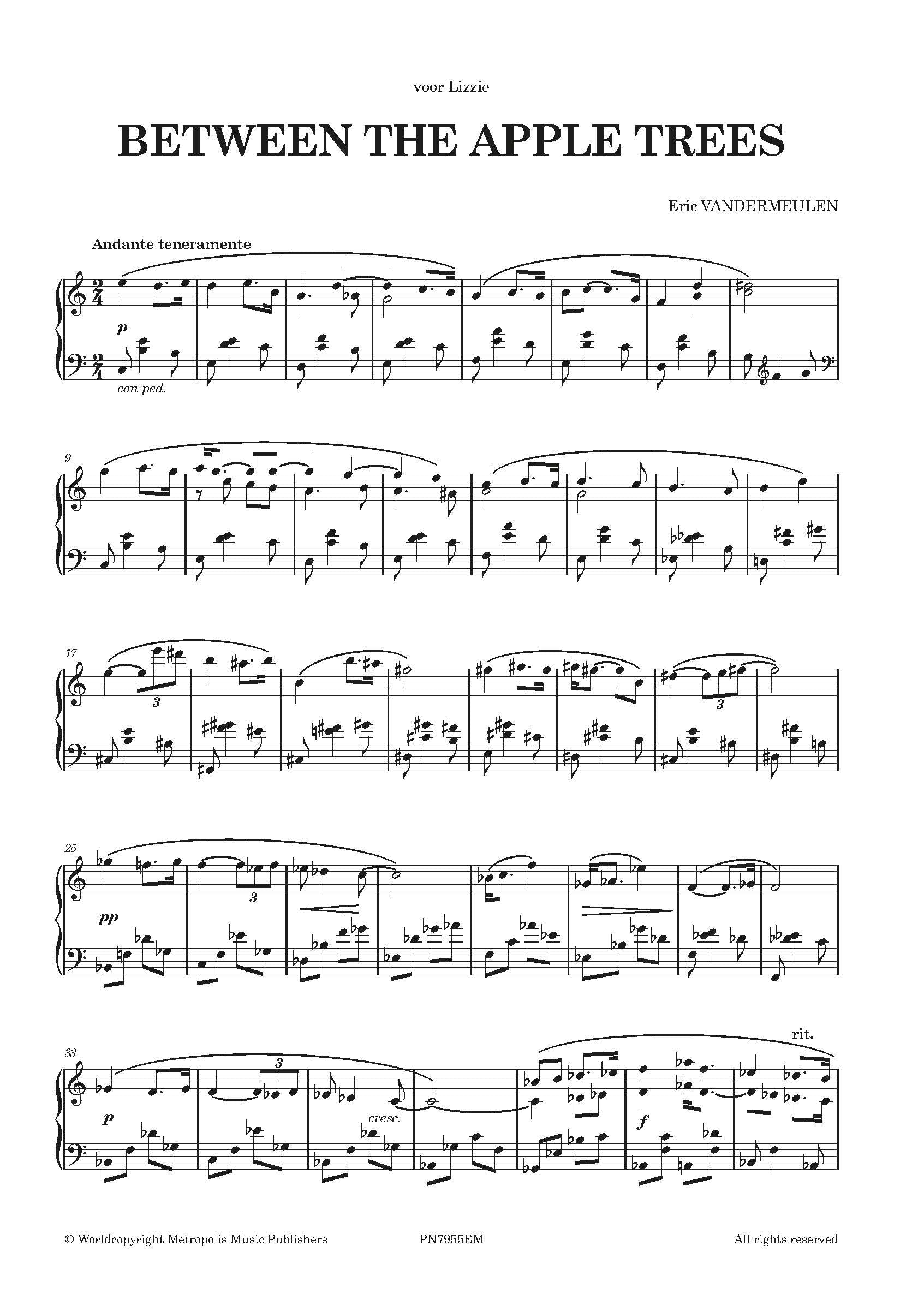 Vandermeulen - Between the Apple Trees for Piano Solo for Piano Solo - Metropolis Music Publishers Sale! from $14.00 Choose format: Printed Book Only Printed book and PDF via Email INSTANT PDF Qty. Add to Cart SKU: PN7955EM Eric Vandermeulen - Between the Apple Trees for Piano Solo Previous Next