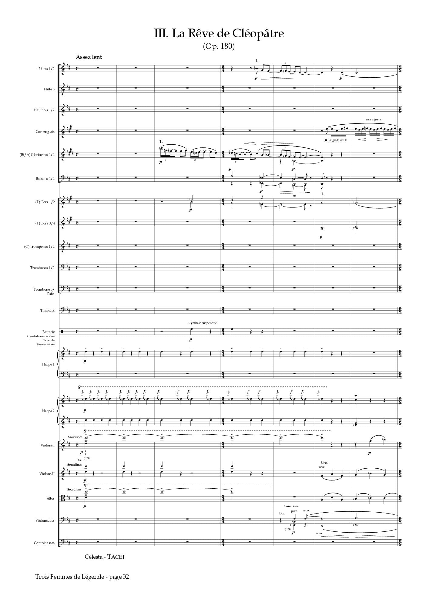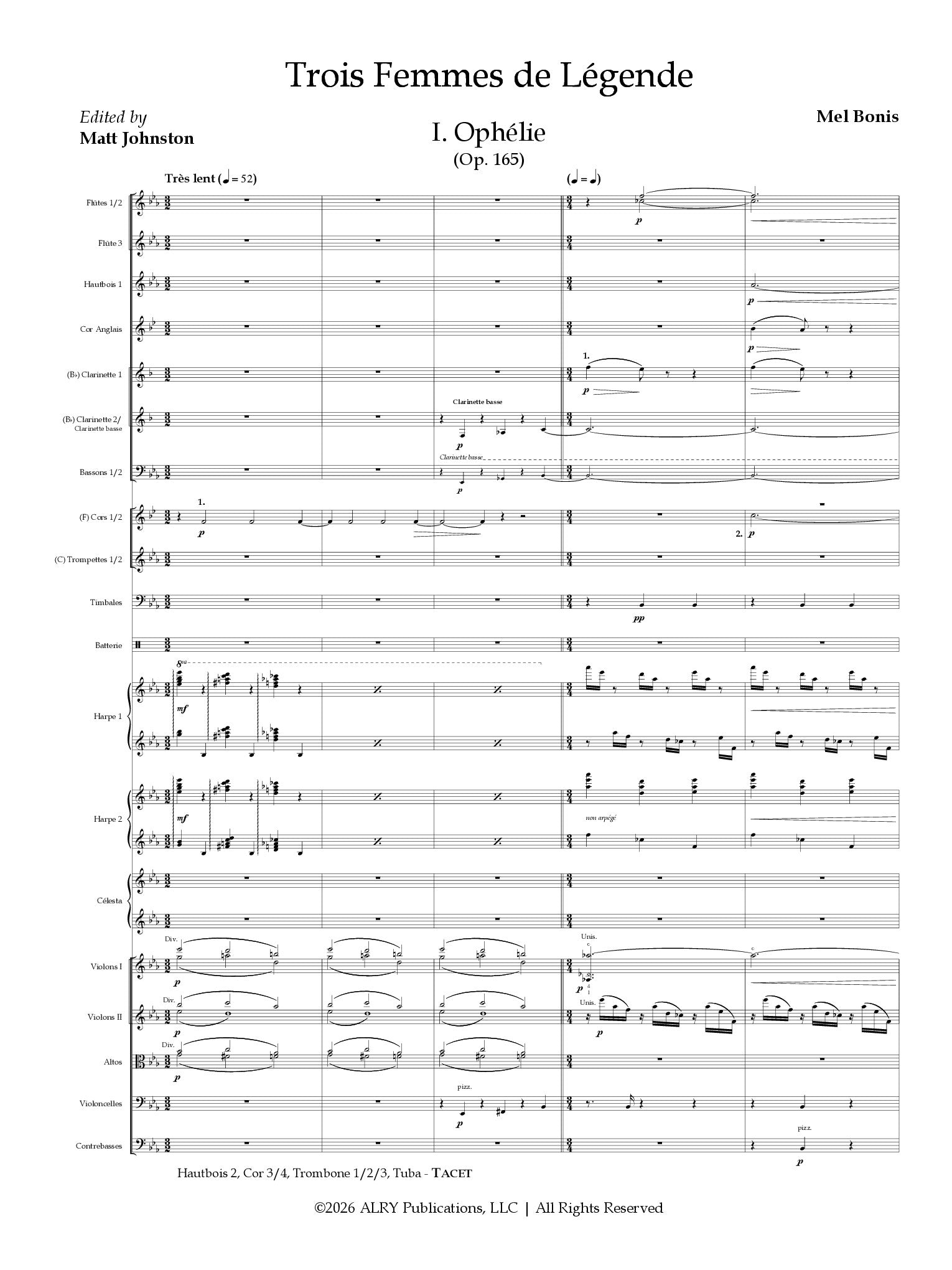 Trois Femmes de Légende for Orchestra by Mel Bonis, edited by Matt Johnston. In three movements: Ophélie (Op. 165), Salomé (Op. 100), and La Rêve de Cléopâtre (Op. 180).