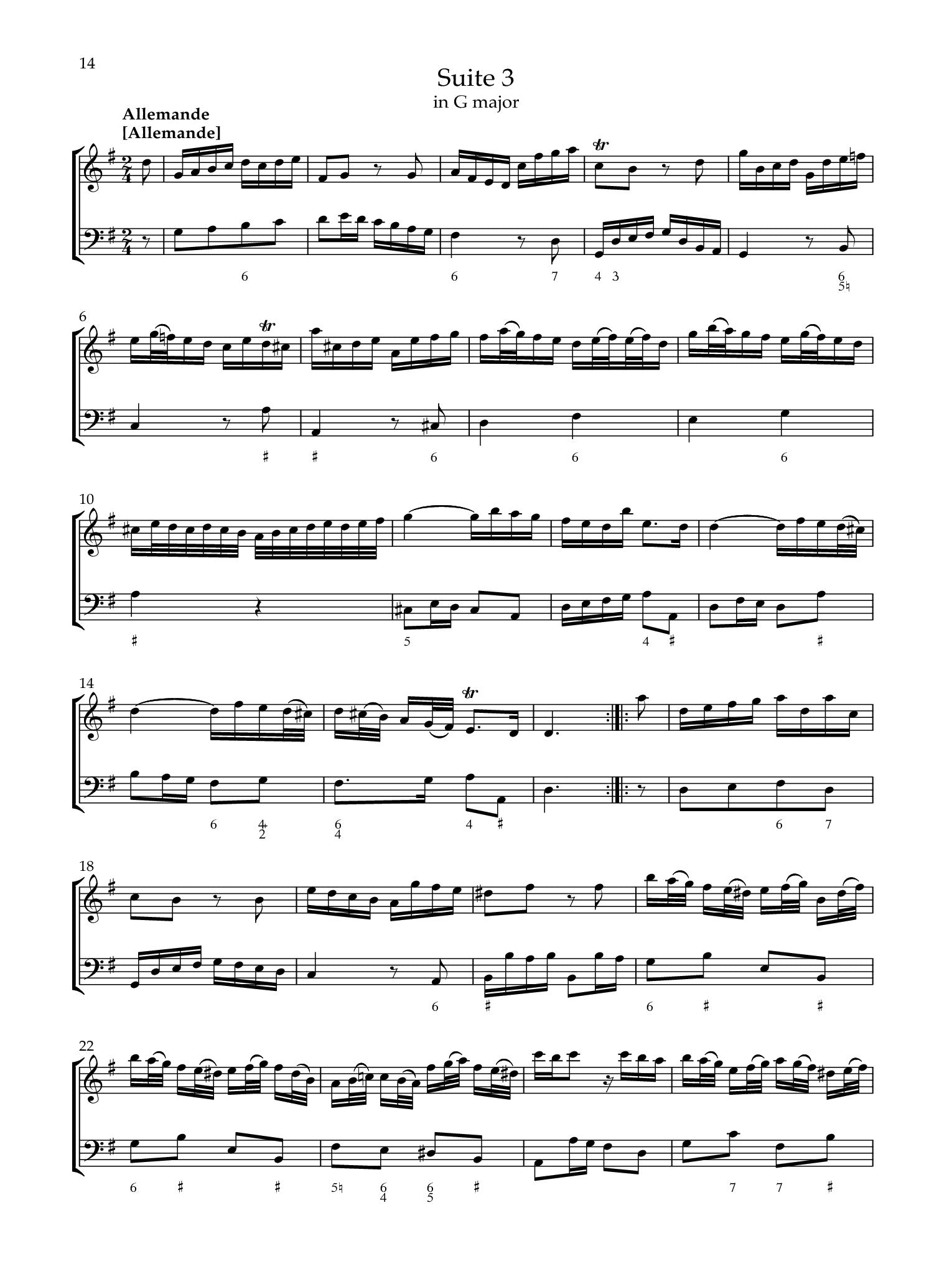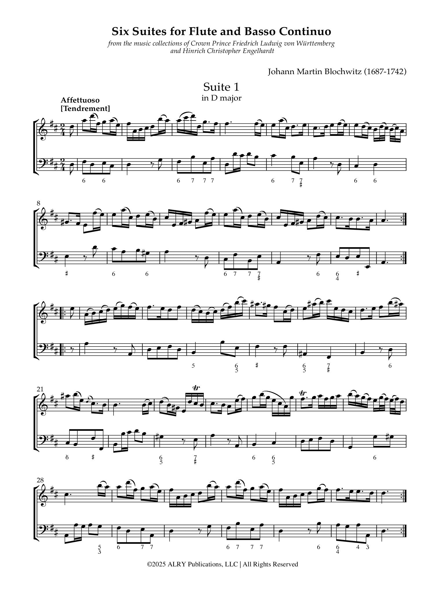Six Suites for Flute and Basso Continuo by Johann Martin Blochwitz from the music collections of Crown Prince Friedrich Ludwig von Württemberg and Hinrich Christopher Engelhardt, edited by Wim Brabants. Contains full score and an additional copy for continuo players.