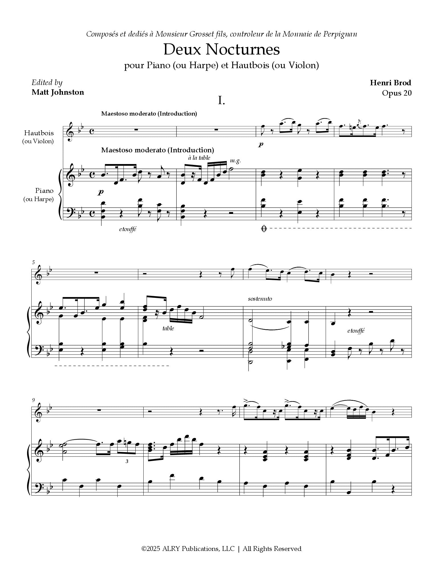 Henri Brod - Deux Nocturnes, Op. 20 pour Piano (ou Harp) et Hautbois (ou Violon). Henri Brod (1799–1839) was a French oboist, composer, and instrument maker who helped shape the modern oboe through his performances, innovations, and collaborations with instrument makers. A virtuoso and accomplished composer, he wrote numerous works for the oboe — including études, chamber pieces, and lyrical concert works — that balanced technical brilliance with expressive, Romantic-era beauty. His Deux Nocturnes, likely written in the early 19th century, reflect the evolving nocturne tradition of the time: gentle, atmospheric pieces evocative of the night and often intended for intimate, evening performances.
