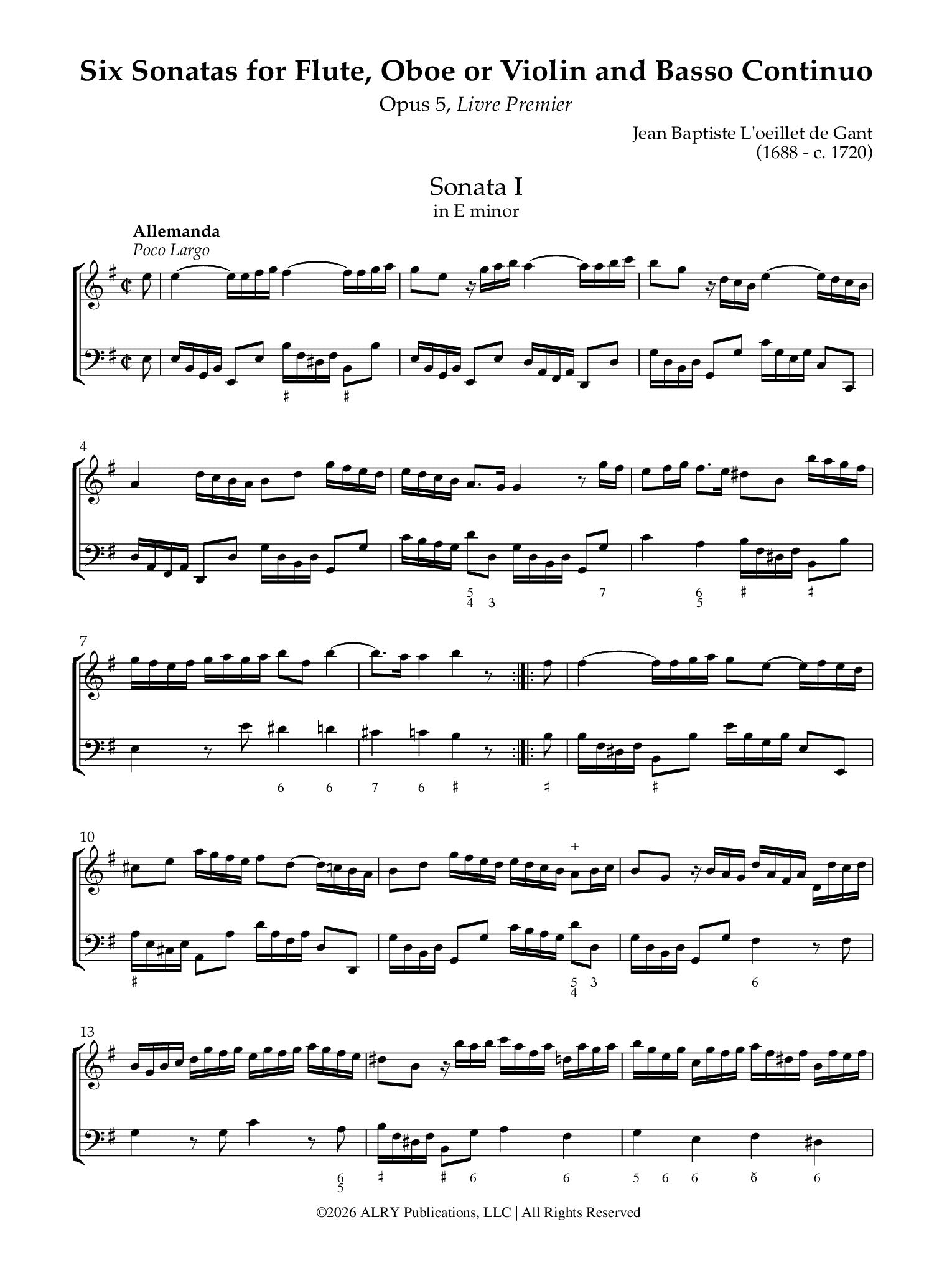 Six Sonatas, Op. 5, Livre Premier for Flute, Oboe or Violin and Basso Continuo by Jean Baptiste L'oeillet de Gant, edited by Wim Brabants. Presented in score form with an additional copy included for the second player.