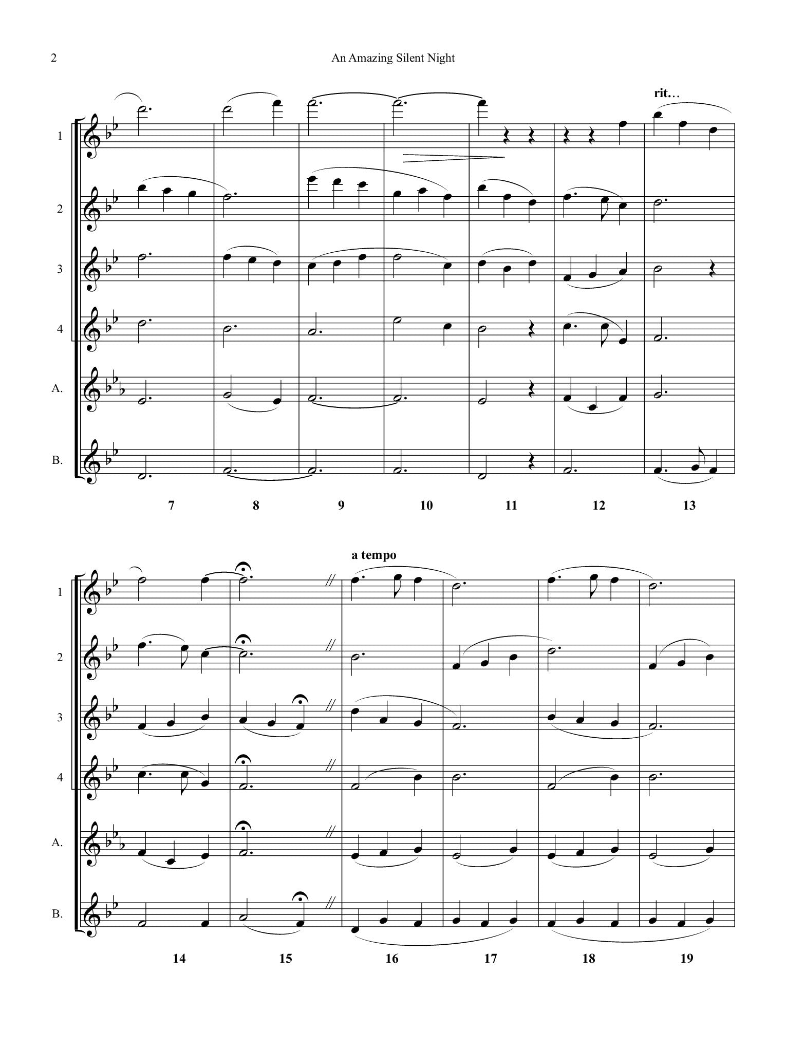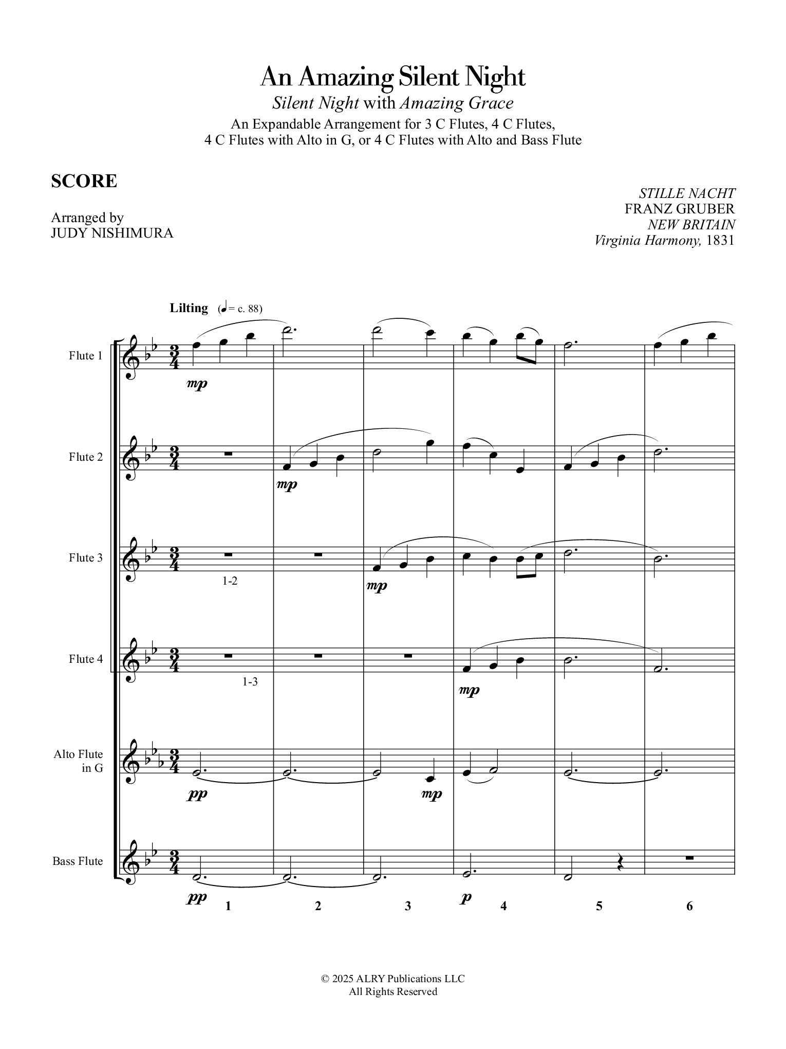 An Amazing Silent Night for Flute Choir, arranged by Judy Nishimura. A combination of the calmest of Christmas carols, “Silent Night,” with the emotional beauty of “Amazing Grace,” here in a flexible arrangement by award-winning composer Judy Nishimura. Can be performed by as few as three C flutes, or expanded to the full flute choir instrumentation, with every combination in between possible.