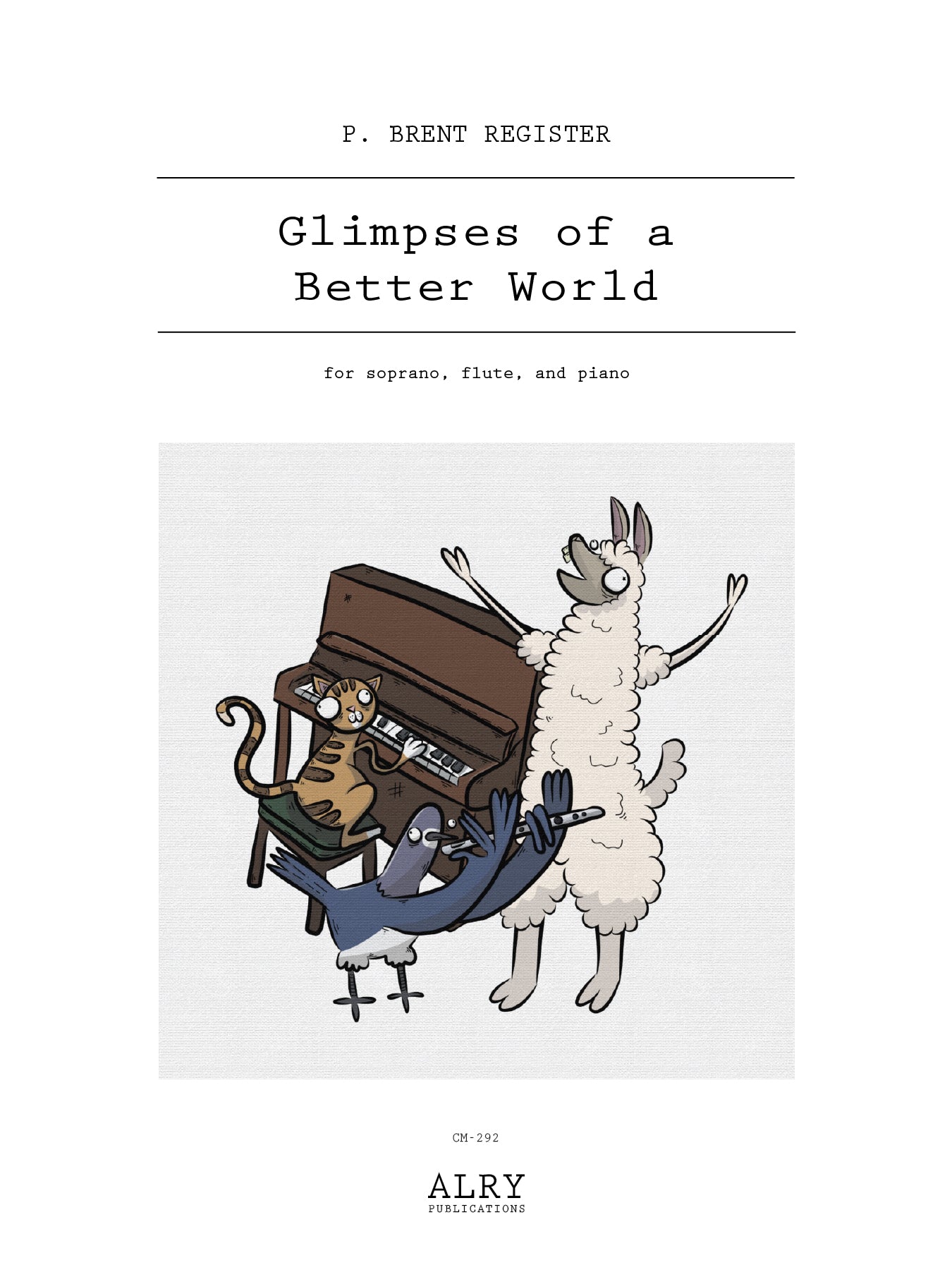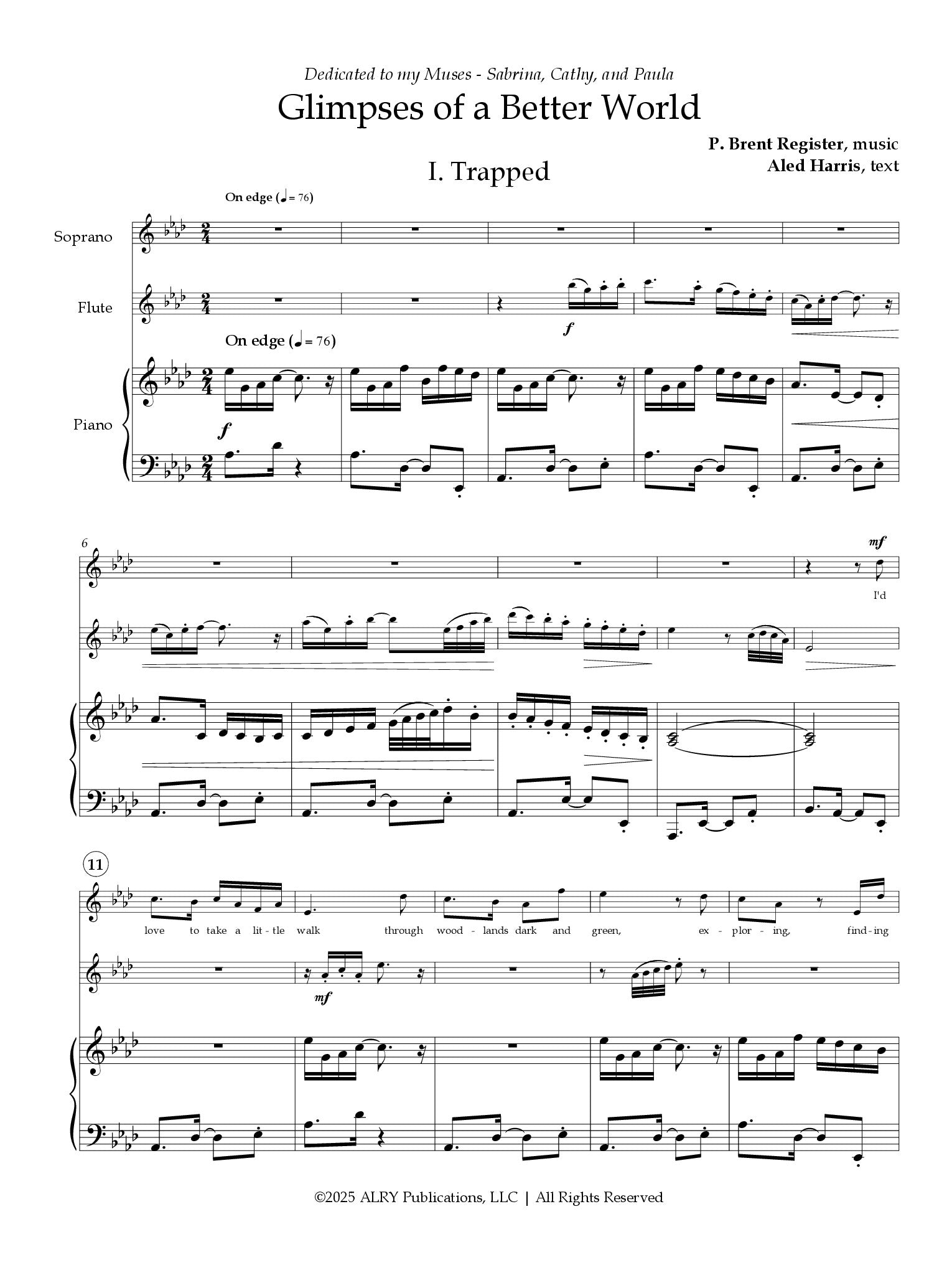 Glimpses of a Better World is a ten-movement work for soprano, flute, and piano, by P. Brent Register, with text by Aled Harris. The movements are titled Trapped, In their silence, Find It, Little Things, Silence, Don't Worry, Language, Be Gentle, Unloved, and I Like Dogs. There is also an additional eleventh song included, upon a special request for a "cat" movement. This movement is titled The Encounter, and is based off a video of Aled Harris playing around with an EWI. Full score and parts included in set.