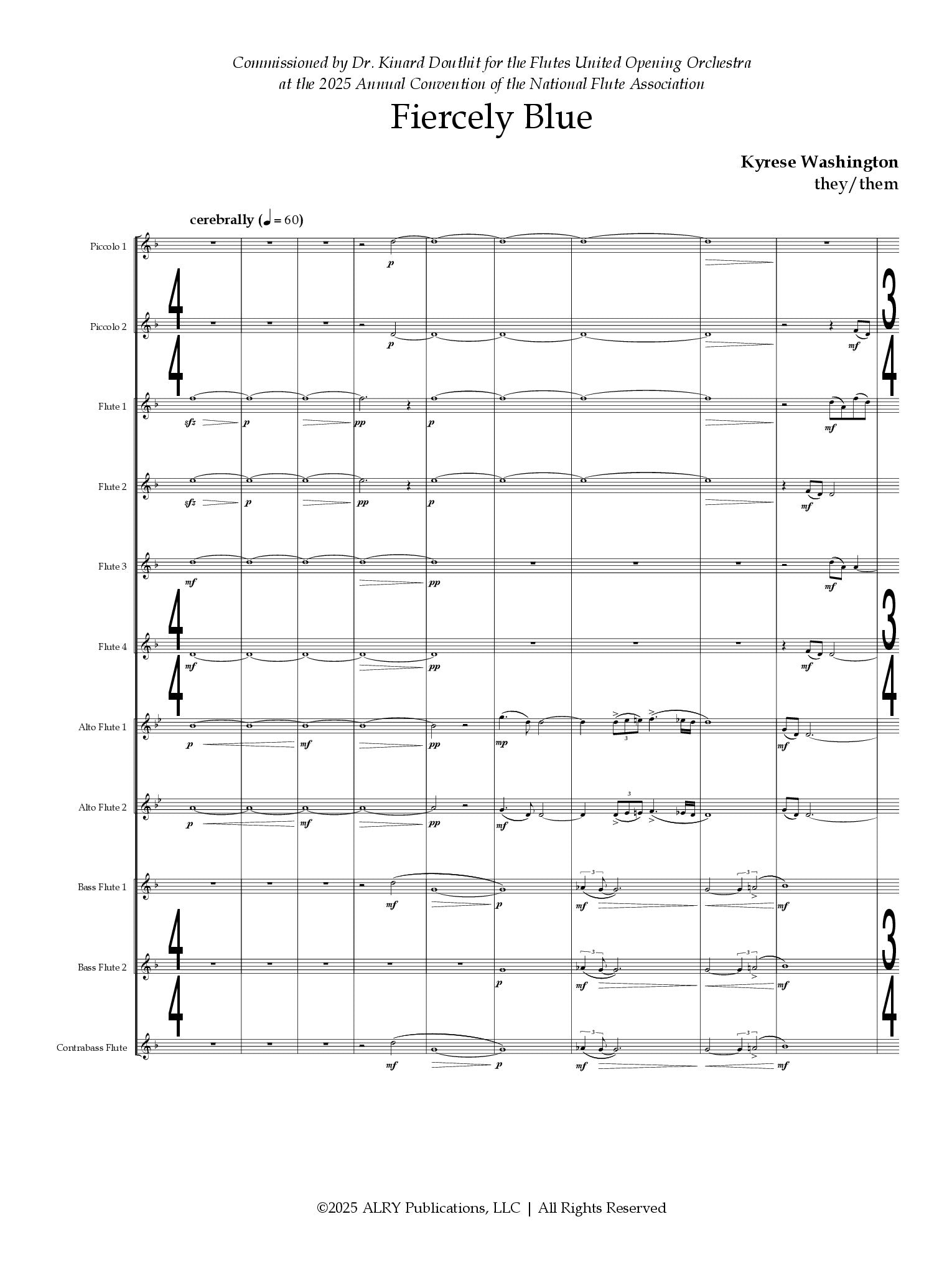 Fiercely Blue for Flute Choir by Kyrese Washington was commissioned by Dr. Kinard Douthit for the Flutes United Opening Orchestra at the 2025 Annual Convention of the National Flute Association in Atlanta, Georgia.