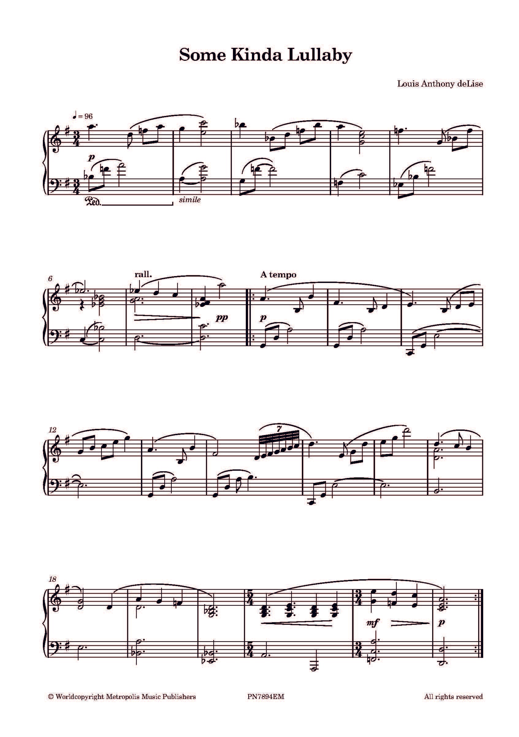 deLise - Some Kinda Lullaby for Piano Solo - PN7894EM Metropolis Music Publishers Sale! from £13.00 Choose format: Printed Book Only Printed book and PDF via Email INSTANT PDF Qty. Add to Cart SKU: PN7894EM Louis Anthony deLise - Some Kinda Lullaby for Piano Solo. Previous Next